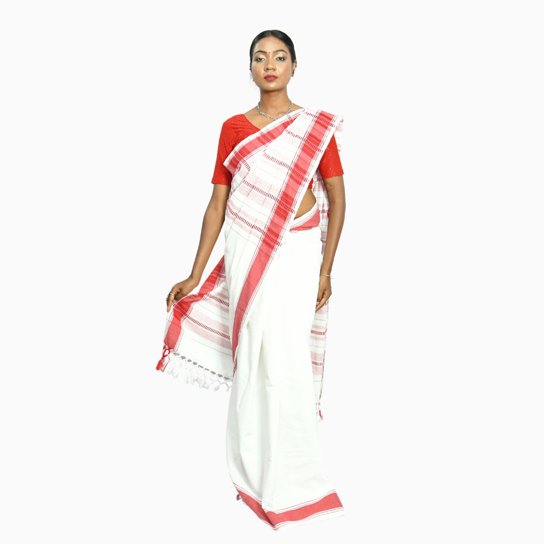 Johar Tribal Mart Adivasi Selfie Saree Cotton White & Red
