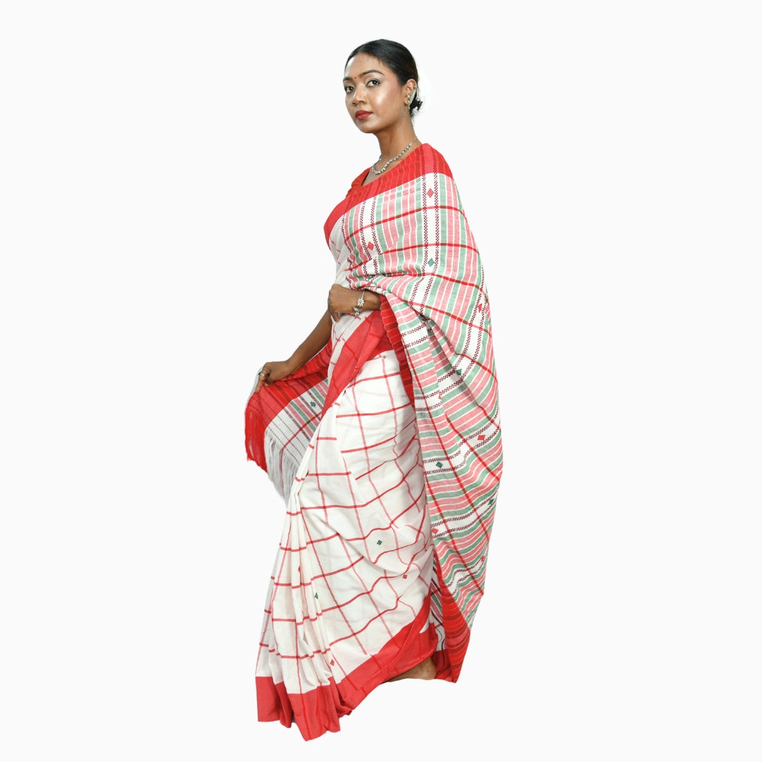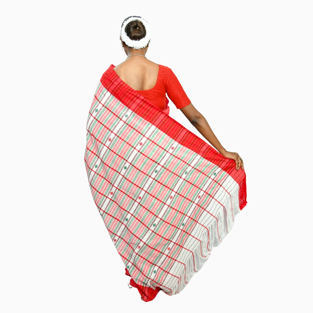 Johar Tribal Mart Handloom Cotton Saree High Quality Multi White & Red